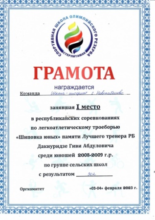 Команда юношей успешно выступила в республиканских соревнованиях по легкоатлетическому троеборью "Шиповка юных " памяти лучшего тренера РБ Дакиуридзе Гиви Абдуловича, который проходил в г.Стерлитамак со 2 по 4 февраля. Поздравляем наших спортсменов и тренера Спиридонова В.И.