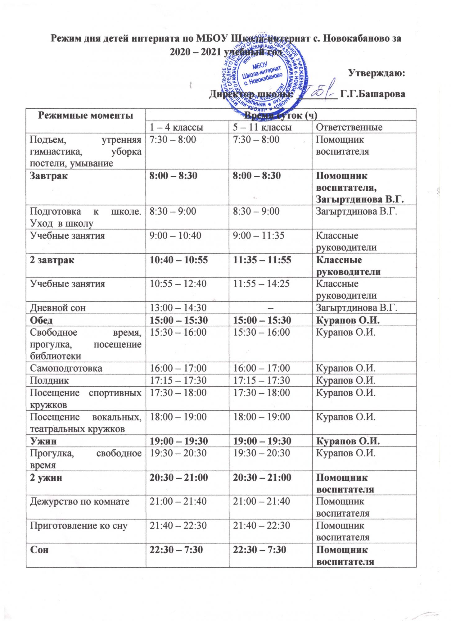Режим дня детей интерната 001