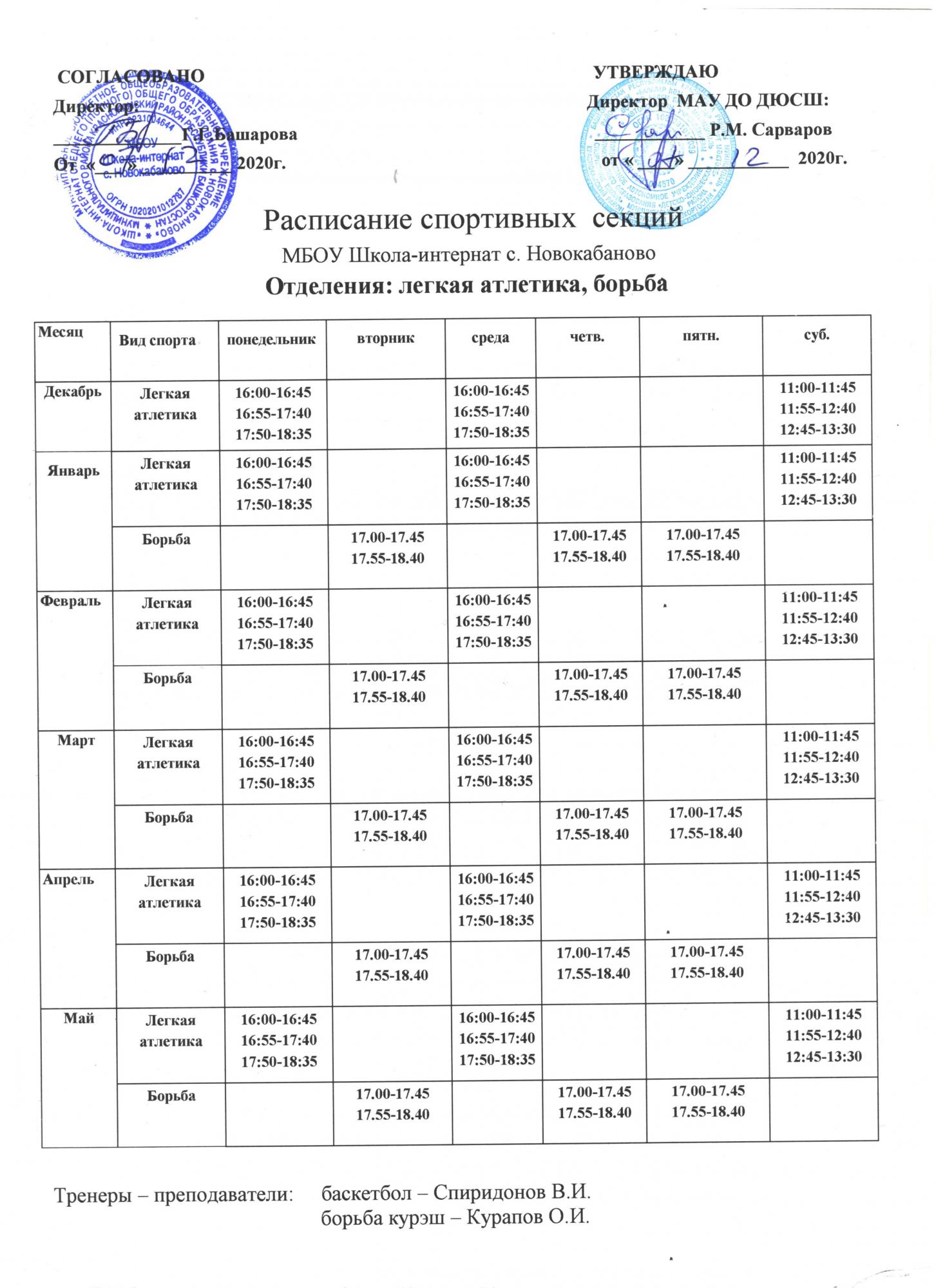 Расписание спортивных секции