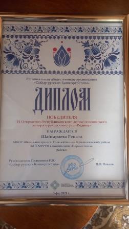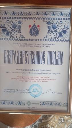 В Уфе прошла торжественная церемония награждения победителей конкурса «Родник», посвященного Дню русского языка и Дню рождения А.С. Пушкина! В этом году число победителей конкурса пополнила ученица 4 класса МБОУ Школа-интернат с.Новокабаново Шайгараева Рената. Благодарственным письмом награждена руководитель Шайгараева Л.И.