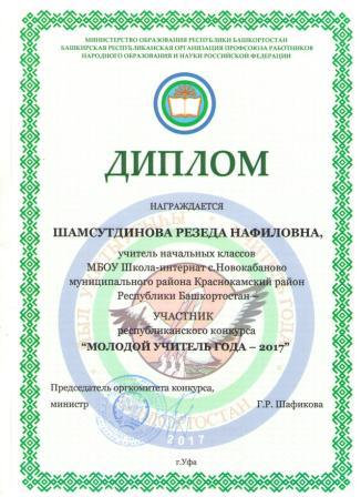 С 3 по 7 апреля в г. Уфа прошел республиканский конкурс "Учитель года -2017". Учитель начальных классов Резеда Нафиловна Шамсутдинова награждена дипломом Министерство образования в номинации "Молодой учитель года 2017".