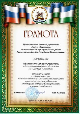 По итогам районного конкурса на лучшее изделие художественного творчества среди педагогических работников "Мастерами славится Башкортостан" учителя школы Анфиса Муллагалиева заняла 1 место в номинации "Вязание" и Венера Загыртдинова заняля 2 место в номинации "Цветочная композиция"